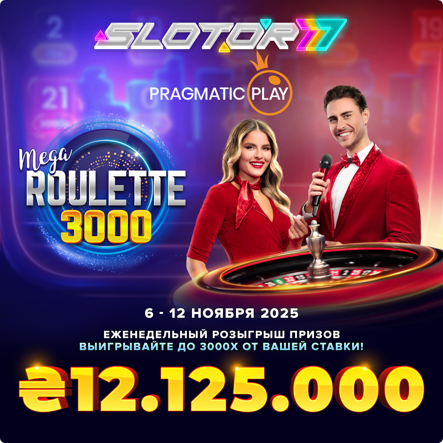 Розыгрыш призов Mega Roulette 3000 проходит с 6 ноября 2025 года, 10:01 CET до 12 ноября 2025 года, 23:59 CET («Период проведения акции»). Это сетевая акция, проводимая Pragmatic Play, и призовые фонды распределяются между различными операторами.